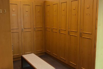 Enjoy a panoramic view of 18 holes in a large space, backed by a large pillar. - Locker Room