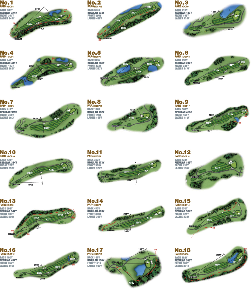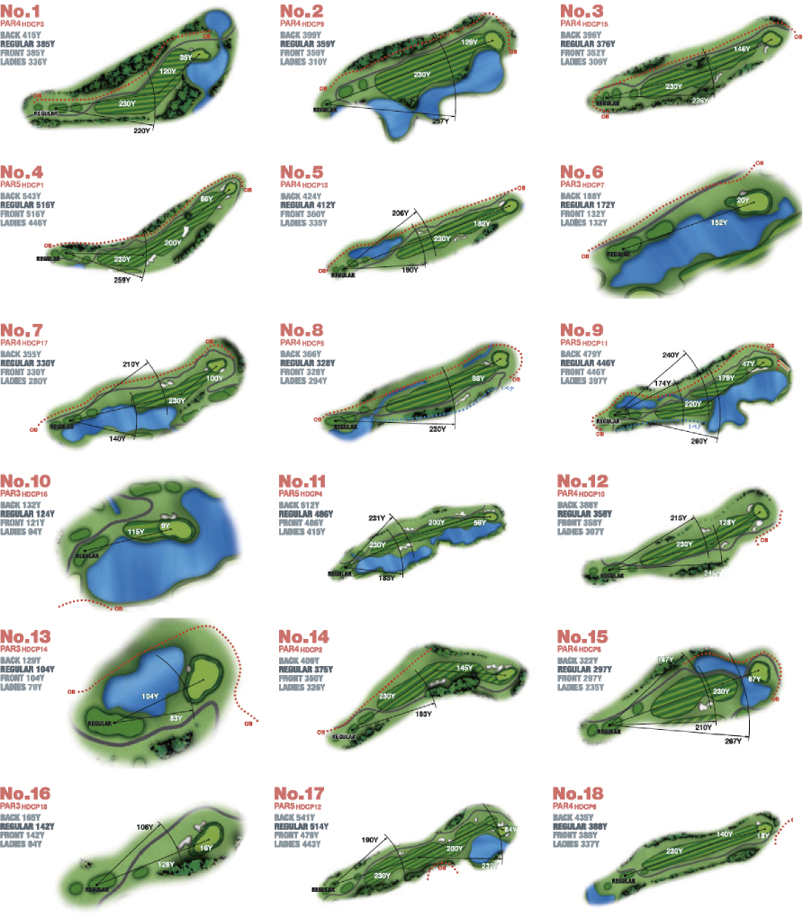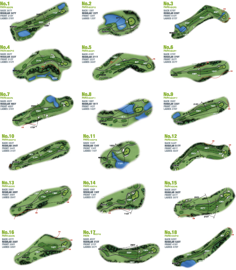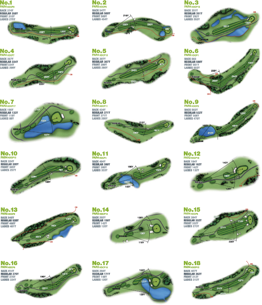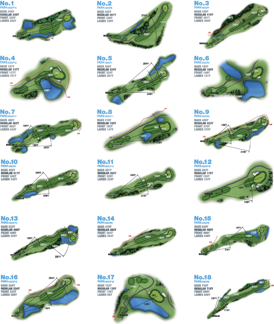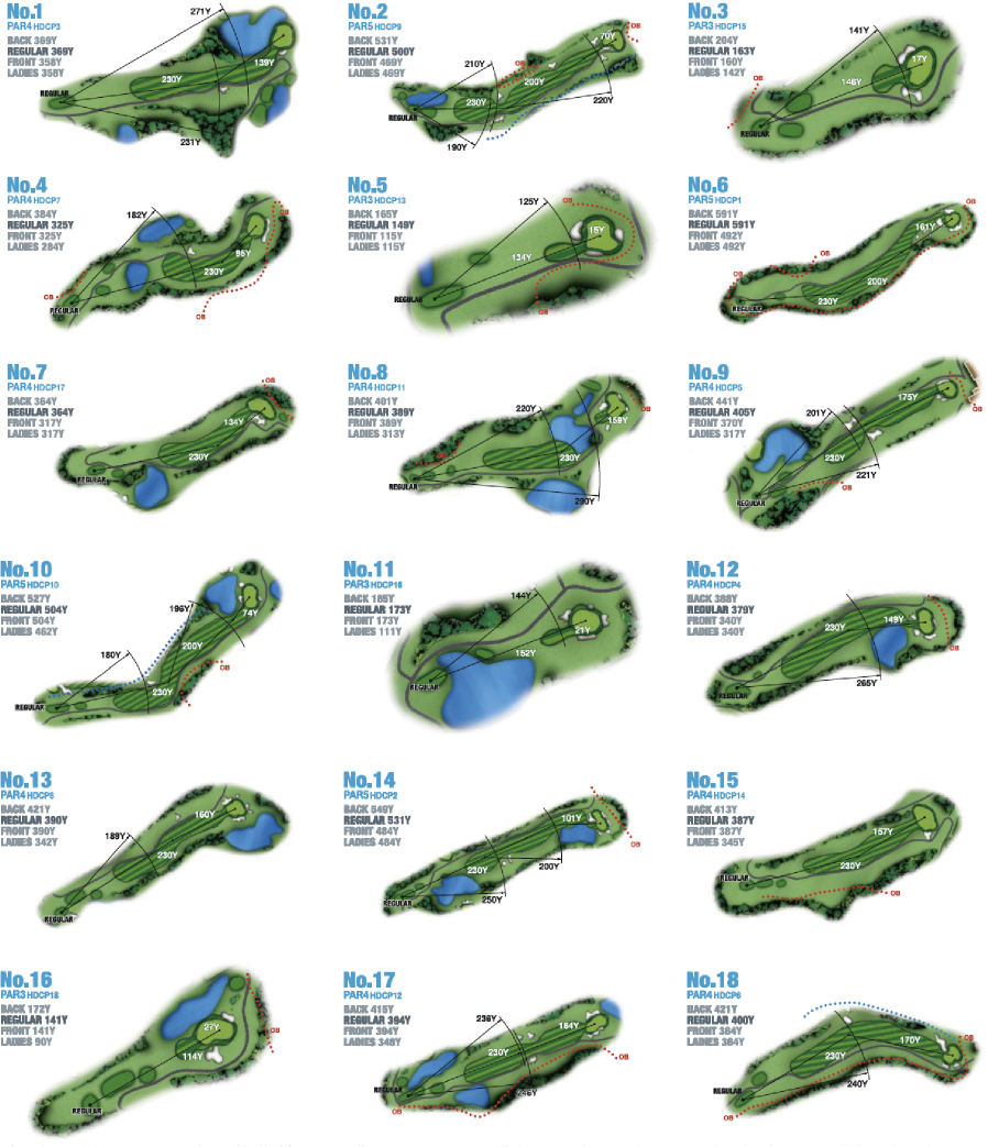 South Course can be played with no break unlike the usual golf courses in Japan. There is no Caddle to attend your round either, you will drive a GPS equipped cart on the course. This challenging course is difficult to play due to its course layout. Undulating fairways and ponds will require strategies and decision-making abilities of players to cope.
